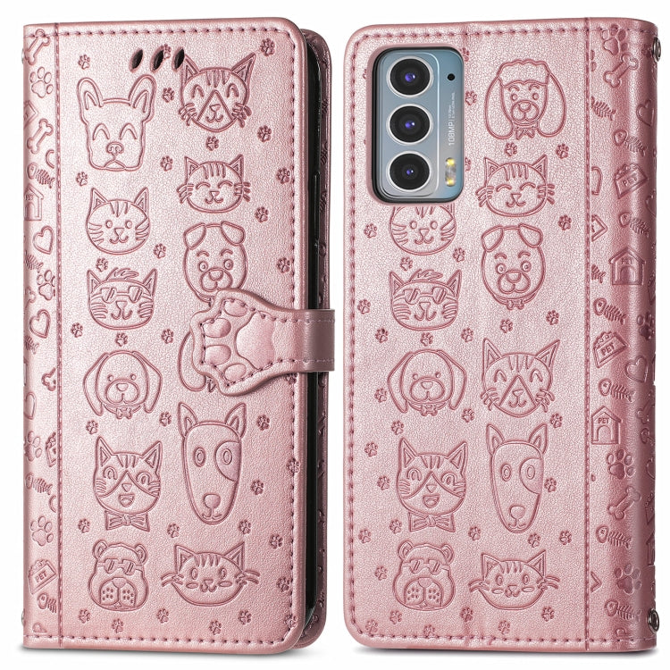 For Motorola Moto Edge 20 Lovely Cat and Dog Embossing Pattern Horizontal Flip Leather Case , with Holder & Card Slots & Wallet & Cartoon Clasp & Lanyard(Rose Gold)