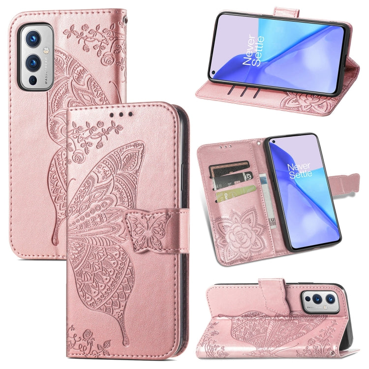 For OnePlus 9 Butterfly Love Flowers Embossed Horizontal Flip Leather Case with Holder & Card Slots & Wallet & Lanyard(Rose Gold)