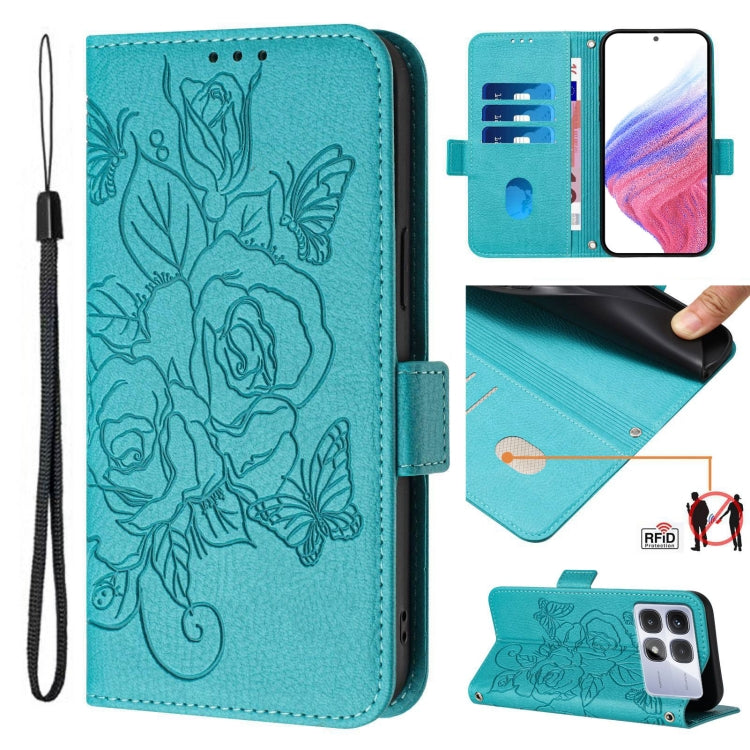 For Redmi K70 Ultra 5G Global Embossed Rose RFID Anti-theft Leather Phone Case(Light Blue)