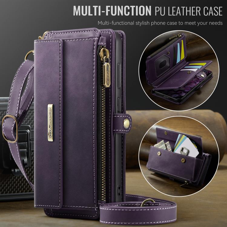 For Samsung Galaxy S21 5G CaseMe C39 RFID Blocking Zipper Wallet Leather Phone Case with Crossbody Strap(Purple)