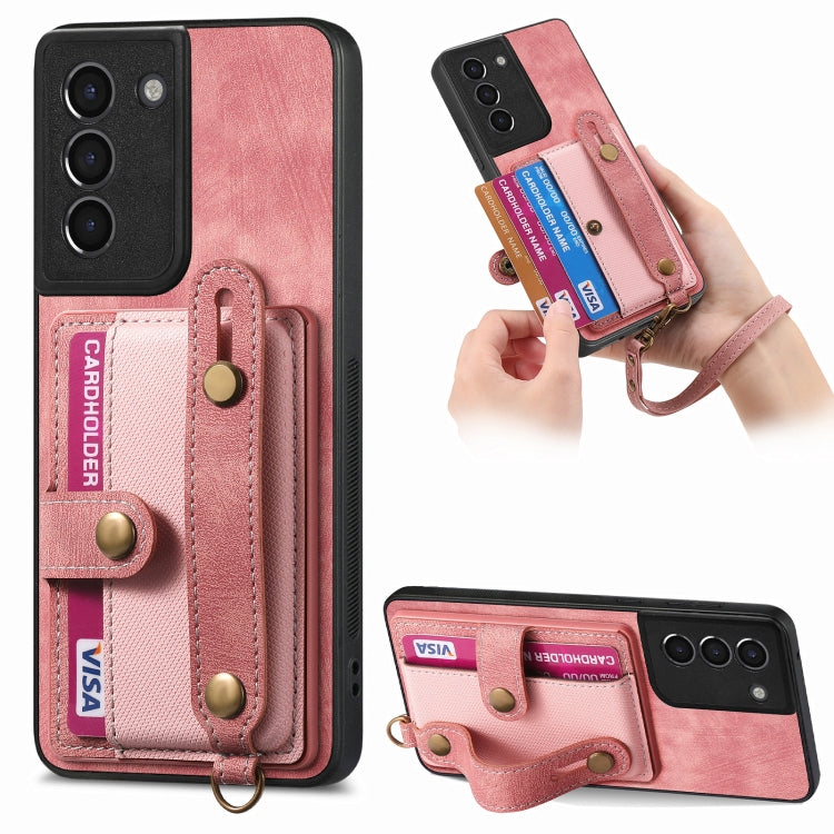 For Samsung Galaxy S21 5G Retro Cross Wristband Wallet Leather Back Phone Case(Pink)