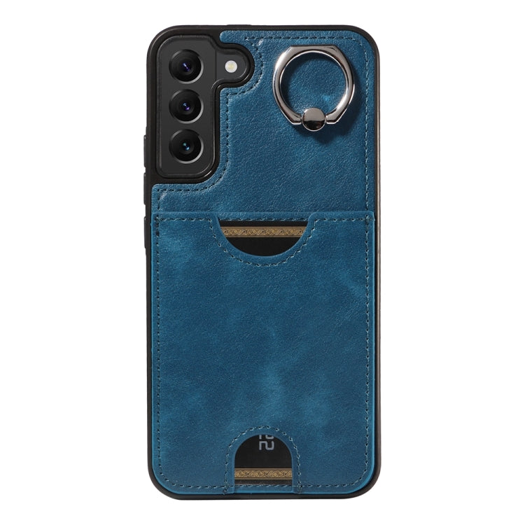 For Samsung Galaxy S22+ 5G Calf Texture Card Slot Ring Holder Phone Case(Blue)