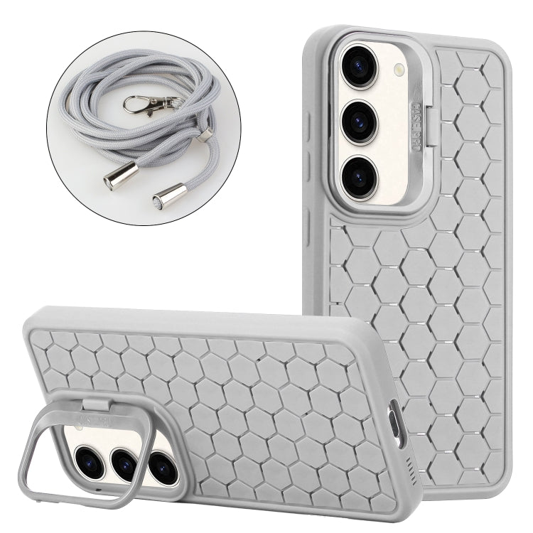 For Samsung Galaxy S23+ 5G Honeycomb Radiating Lens Holder Magsafe Phone Case with Lanyard(Grey)