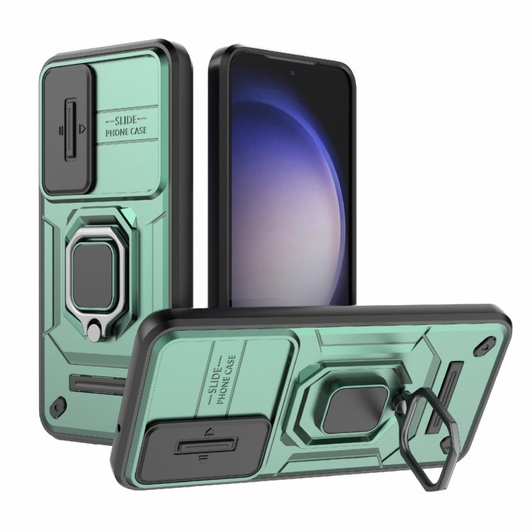 For Samsung Galaxy S23 5G Sliding Camshield TPU + PC Shockproof Phone Case with Holder(Green)