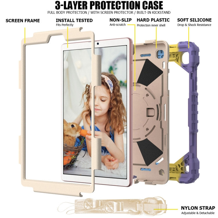 For Samsung Galaxy Tab A7 Lite T220 / T225 Contrast Color Robot Shockproof Silicon + PC Protective Case with Holder & Shoulder Strap(Colorful Purple Beige)
