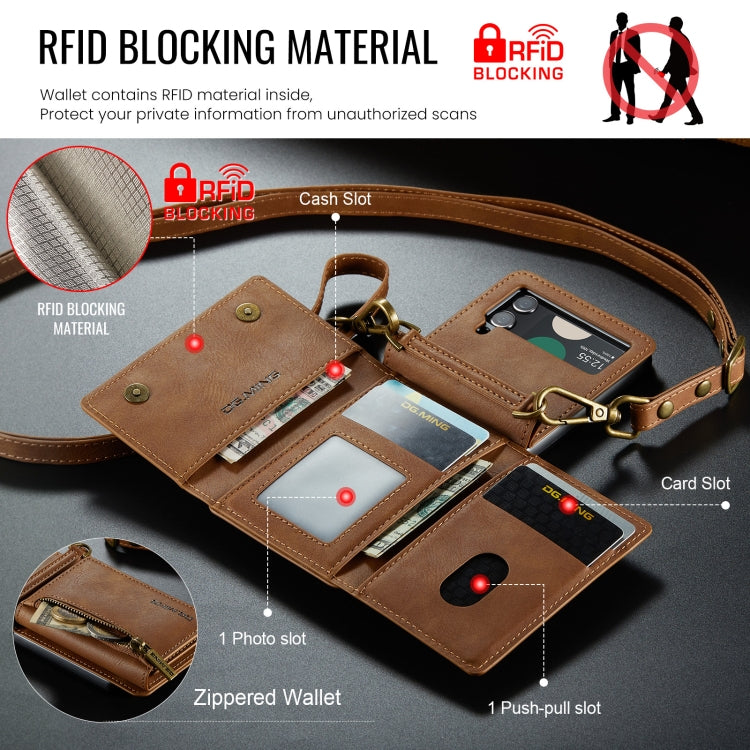 For Samsung Galaxy Z Flip4 5G DG.MING M5 Series Zip RFID Multi Card Detachable Leather Phone Case with Long Lanyard(Brown)