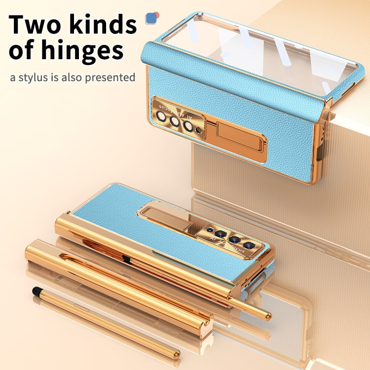 For Samsung Galaxy Z Fold4 Litchi Pattern Magnetic Shell Film Integrated Shockproof Phone Case(Blue Gold)