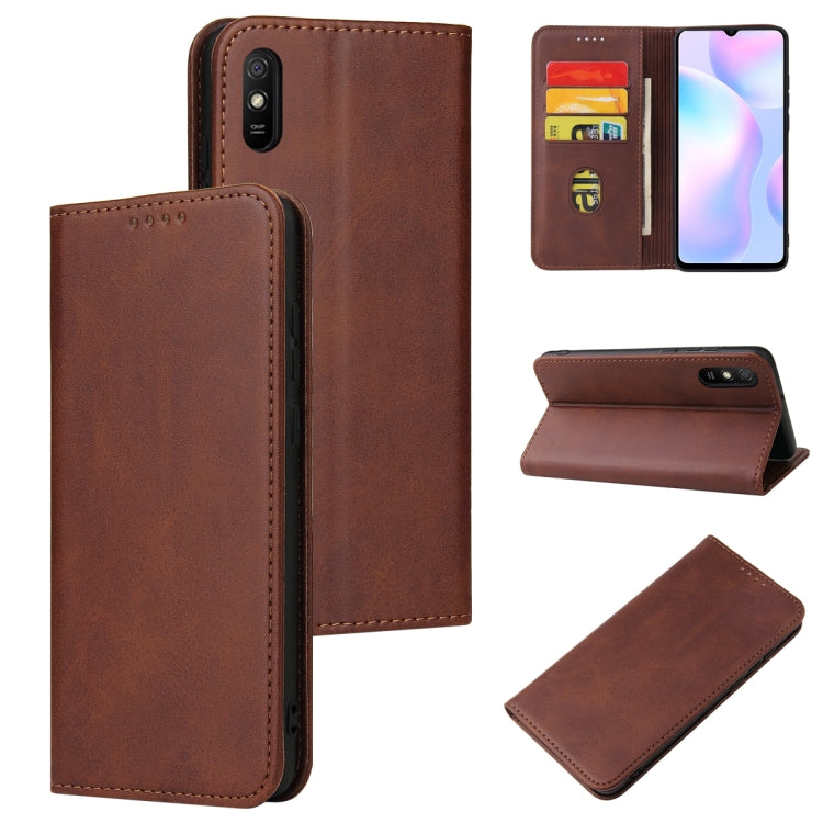 For Xiaomi Redmi 9A Calf Texture Magnetic Horizontal Flip Leather Case with Holder & Card Slots & Wallet(Brown)