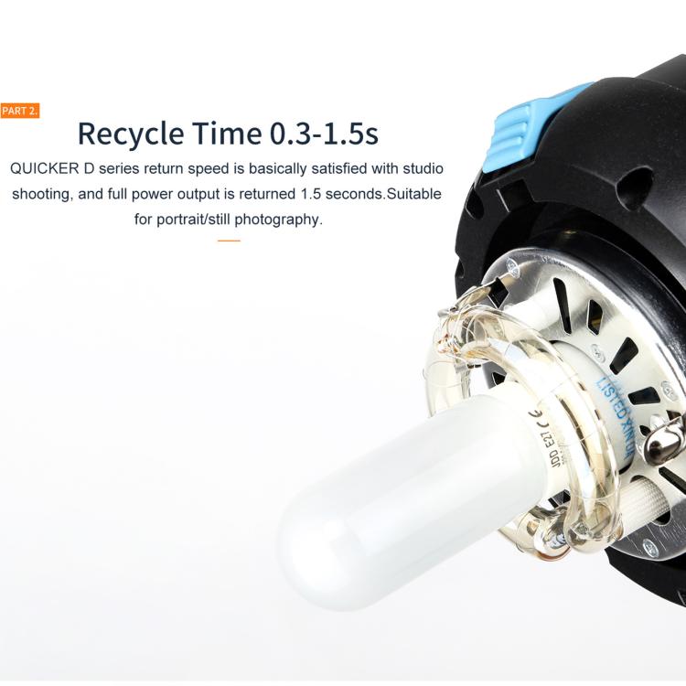1. Godox QS series are available in several power versions from 300Ws to 1200Ws, they are characterized by a range of flash energy regulation in the range of 5 degrees of aperture (1/1 - 1/32, with an accuracy of 0.1 EV). Recycle time to full flash energy in less than 1.5 seconds. At minimal power, it achieves a very short flash duration, only 1/2000s (t = 0.1), which allows free shooting during the session. The flash color temperature is 5600K and may change within ??± 200K depending on the flash energy set.