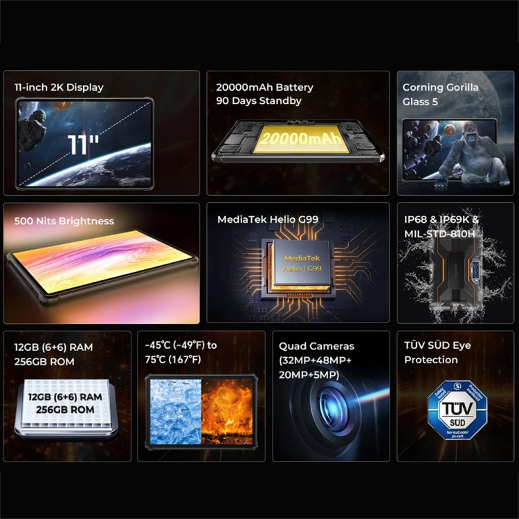 OUKITEL RT8 4G Network IP68/IP69K Rugged Tablet, 6GB+256GB, 11 inch Android 13 MediaTek Helio G99 Quad Core Support Dual SIM, EU Plug(Black)