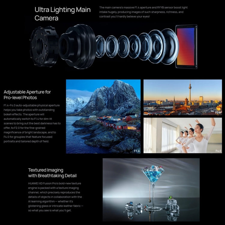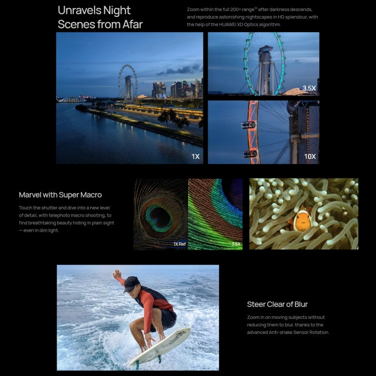 3. Equipped with 4 cameras: Rear cameras: 48MP super-spotting camera (F1.4~F4.0 aperture, OIS optical image stabilization) + 13MP ultra-wide-angle camera (F2.2 aperture) + 48MP super-spotting night vision telephoto camera (F2.1 aperture, OIS optical image stabilization); Front cameras: 13MP ultra wide-angle camera (F2.4 aperture). You can capture wonderful moment with ease, and take high quality pictures.