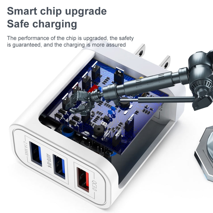 3. One QC3.0 3.0A high current output USB interface, two 2.1A fast charging USB interfaces