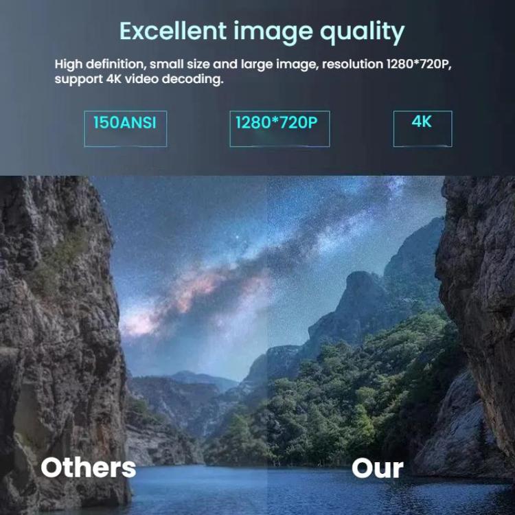 5. Native 720P, support 4K: The projector has a native resolution of 1280 x 720, a brightness of 150 ANSI lumens, supports full 4K HD video, and can present clear and bright images in dark environments, which is very suitable for home theater, entertainment and video conferencing, online teaching.