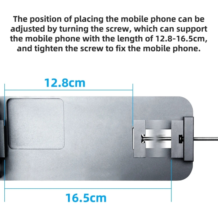 9. The position of placing the mobile phone can be adjusted by turning the screw, which can support the mobile phone with a length of 12.8-16.5cm, and tightening the screw to fix the mobile phone