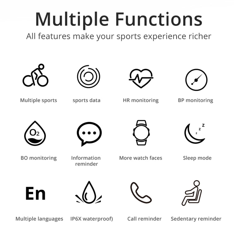 9. Functions: step counting, sleep, heart rate, blood pressure, blood oxygen, call reminder, multi-sports mode, find mobile phone, dial selection, stopwatch, music control, sedentary reminder, drink reminder, alarm clock, raise your hand to brighten the screen, dial Replacement, remote camera, phone SMS notification; WeChat, QQ, Twittre, Facebook, Whatsapp, Skype and other third-party information reminders