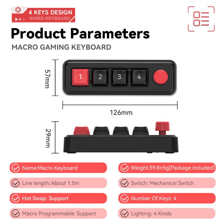 1. Compact gaming keyboard with 4-key macro programming: A 4-key macro-defined gaming keyboard designed for efficient operation, featuring a dual Type-C port key-line separation structure, compact and portable, suitable for both gaming and office scenarios.
