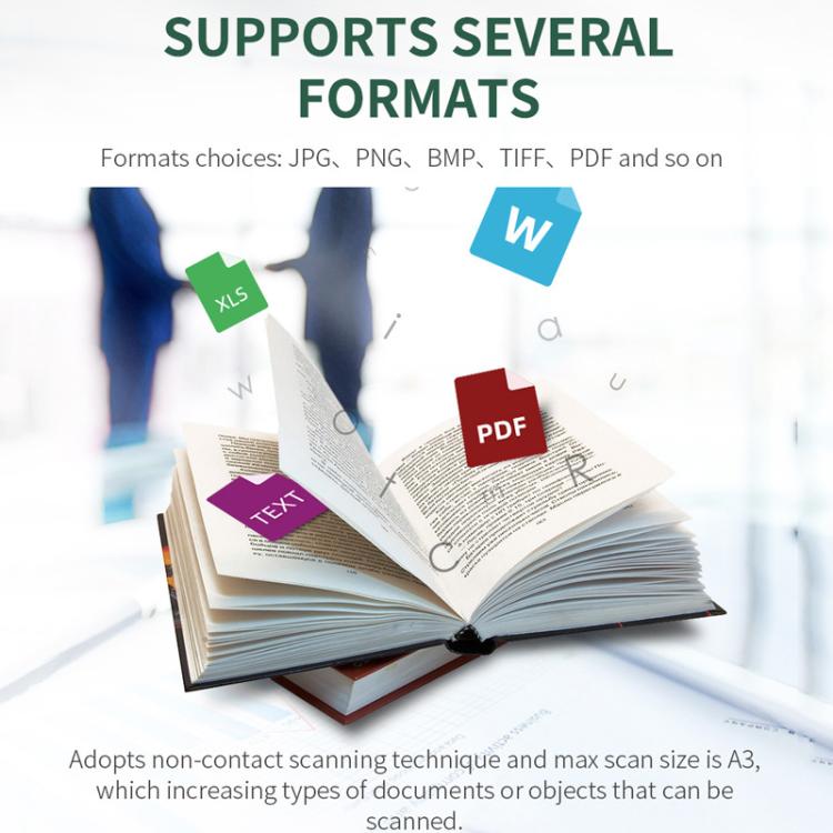 1. 12MP A3 document camera (compatible with A4/A5/A6), adjustable shooting frequency enables continuous scanning. With auto-cropping selection and one-click ID photo composition for white-background ID photos. Features 3-level 4-LED fill lights and OCR text recognition supporting 200+ languages