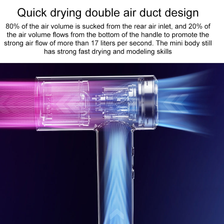3. Quick-drying double air duct design, 80% of the air volume is sucked in from the rear air inlet, and 20% of the air volume flows in from the bottom of the handle, advancing over 17 liters of strong air flow per second.