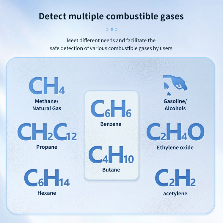 6. Measurable gases: ethanol, propanol, acetylene, ammonia, benzene, methane, ethane, propane, butane, 7. Butylene oxide, gasoline, hydrogen, naphtha natural gas, paint thinner, etc.