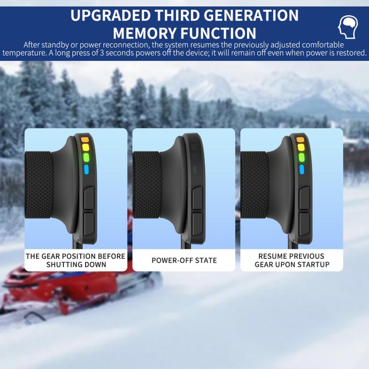 12. Five temperature settings, intelligent temperature control, and 10-second quick heating for a warm ride. AI-powered intelligent heating chip, ergonomic heating, zoned heating from palm to fingertips, and high-power, fast heating.
