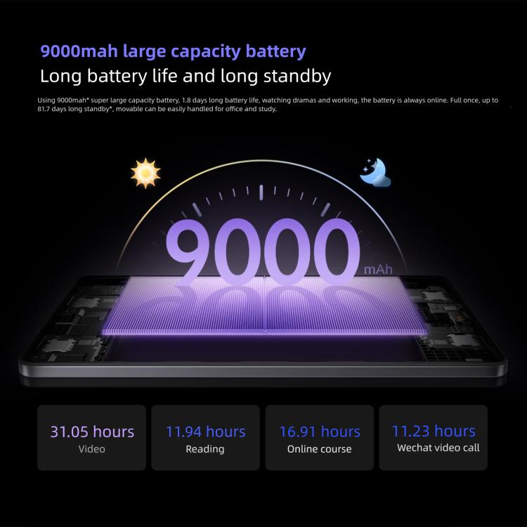 3. Display: 11 inch 2.5K LCD screen, 2560x1600 resolution, 274 PPI, up to 600nits brightness, up to 90Hz refresh rate, up to 360Hz finger touch sampling rate, 240Hz stylus touch sampling rate, support Rheinland hardware low blue light, no flicker, rhythm friendly certification.