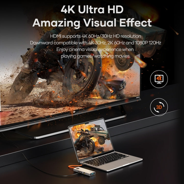 ROCK TR28 HDMI 4K Gigabit Network PD Quick Charger 6 in 1 USB 3.0 HUB (Silver Black)