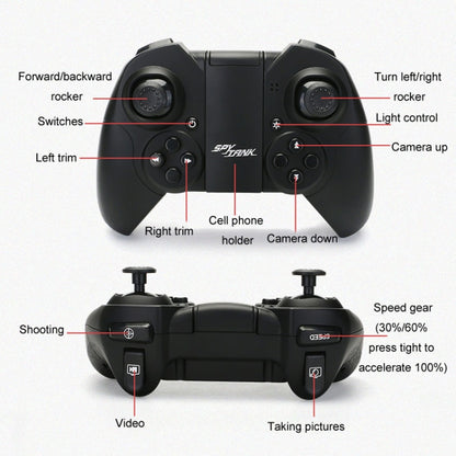 8. Functions: forward, backward, left turn, right turn, left fine-tuning, right fine-tuning, camera up and down, taking photos and videos