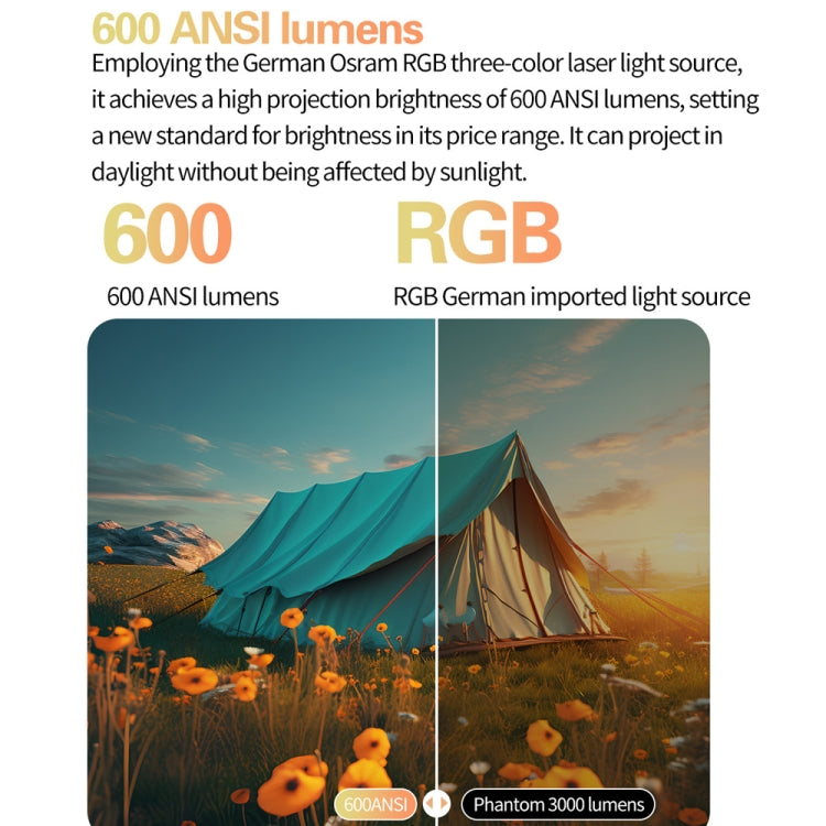 2. Using OSRAM RGB tri-color laser light source, projection brightness up to 600ANSI, direct projection during the day, no fear of sunlight