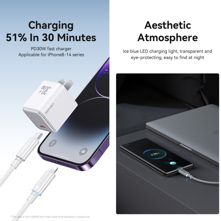 USAMS Type-C To 8 Pin Aluminum Alloy Clear LED 30W PD Fast Charge Data Cable, Length:1.2m(Black)