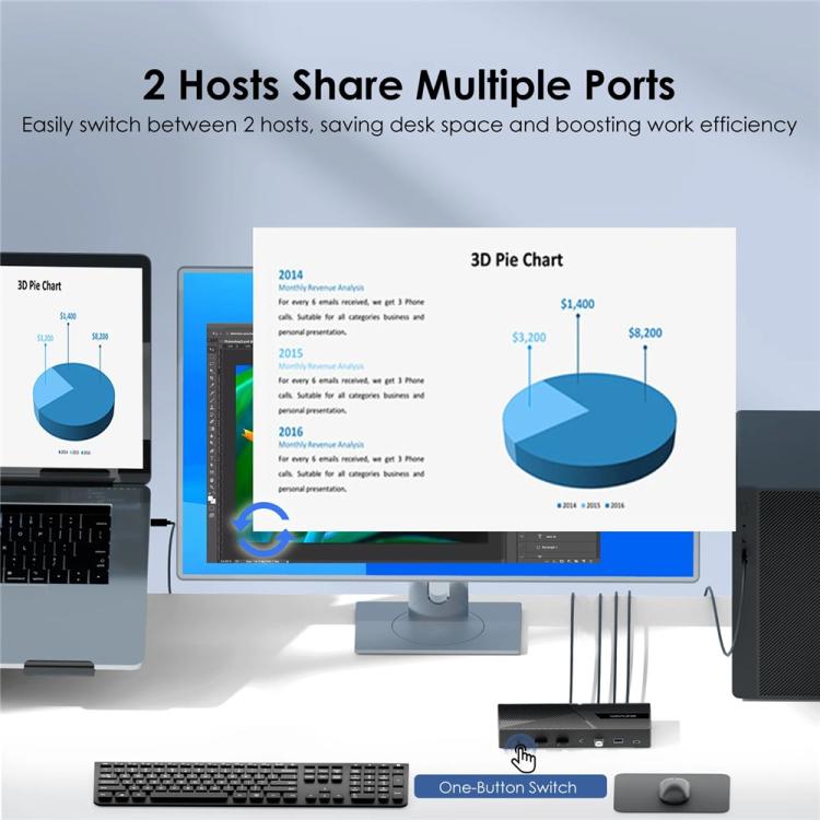 4.Dual Host Connectivity:Two USB-C ports support 10Gbps and 100W upstream charging for two host laptops.