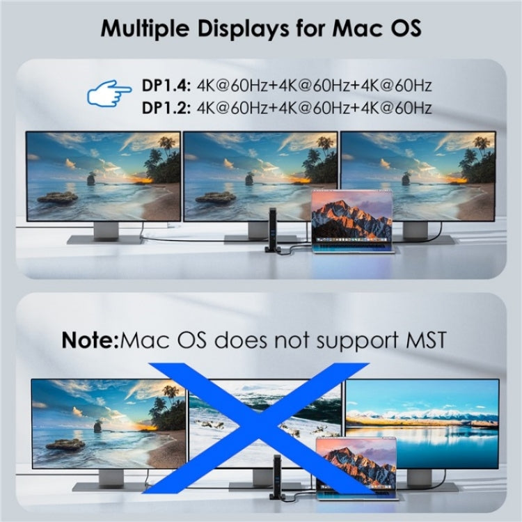 4. Plug-and-Play with No External Drivers Needed: For Macs do not support MST and can only extend to one additional screen (ABBB). Some laptops may only support up to three displays (including the host screen) due to graphics card limitations