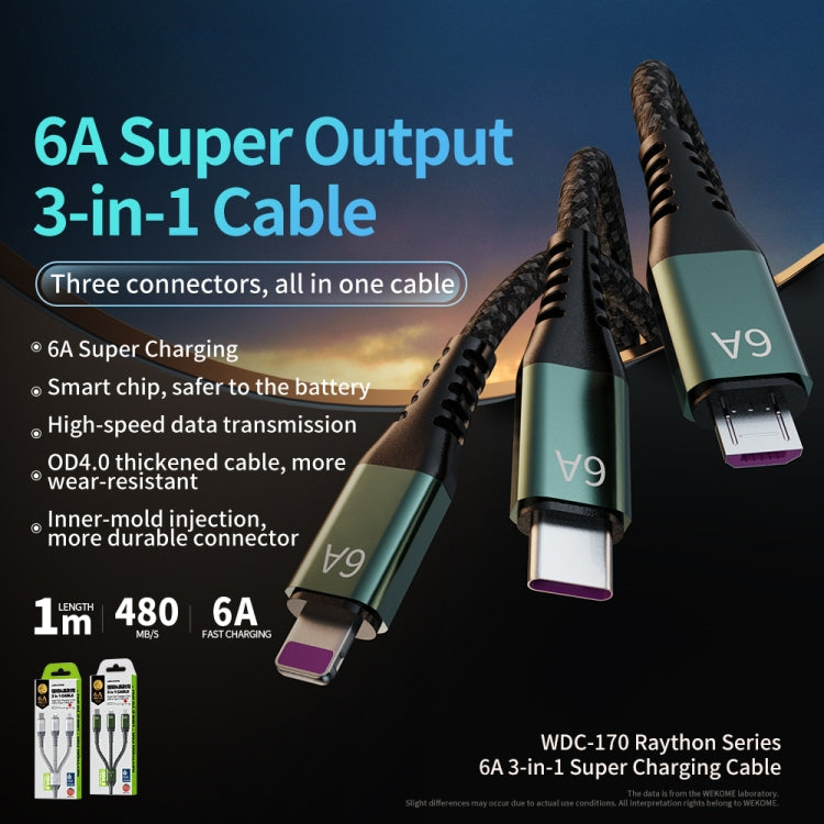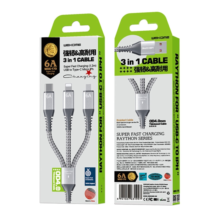 WEKOME WDC-170 Raython Series 6A 3 in 1 USB to 8 Pin+Type-C+Micro USB Fast Charge Data Cable Length: 1.2m(Silver)