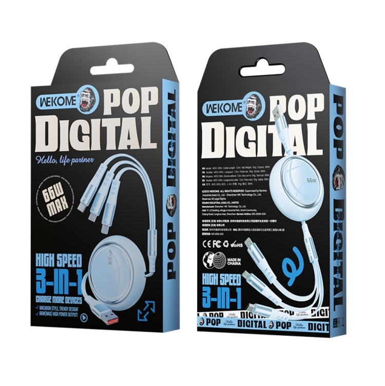 WK WDC-05 66W 3 in 1 USB to 8 Pin + Micro USB + USB-C / Type-C Retractable Fast Charging Data Cable, Length: 1.2m(Blue)