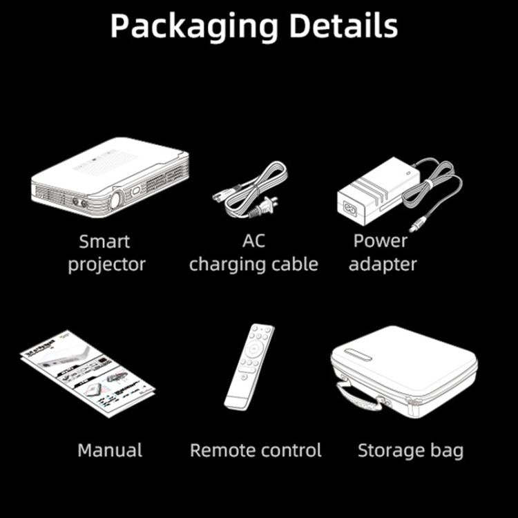 9. Supports digital zoom, automatic source detection, automatic image flip, automatic keystone correction, overheat protection, fan fault protection, intelligent cooling control, low-battery alarm, battery level detection and display, timed power off, 3D red and blue mode