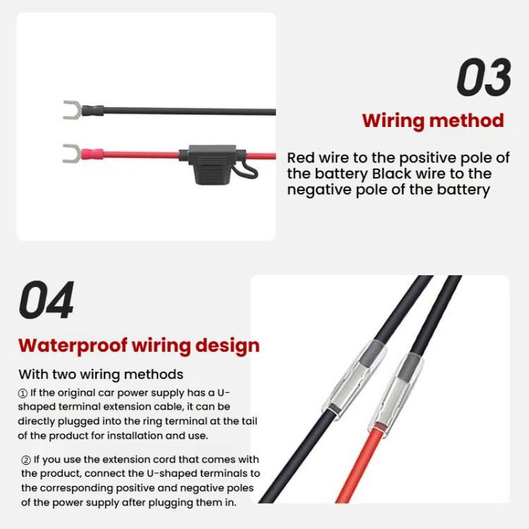 12. Two wiring methods are safe and simple. The waterproof ring terminal at the end of the wire is directly connected to the positive and negative poles of the power supply or connected to the positive and negative poles of the power supply through the ring terminal and the extended U-shaped terminal