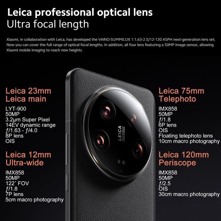 1. Rear camera:50MP 1-inch variable aperture main camera (f/1.63 - f/4.0 stepless variable aperture, equivalent 23mm focal length, supports four-in-one 3.2μm large pixel output, HyperOIS super optical image stabilization, Octa-PD phase focusing, 8P coating) + 50MP Leica floating telephoto (f/1.8 aperture, equivalent 75mm focal length, supports OIS optical image stabilization, 10cm macro) + 50MP Leica close-up telephoto (f/2.5 aperture, equivalent 120mm focal length, supports OIS optical image stabilization) shake, supports Zoom EIS anti-shake, 30cm telephoto macro) + 50MP Leica ultra-low distortion wide-angle (f/1.8 aperture, 12mm equivalent focal length, 122 degree ultra-wide angle, AF autofocus, 5cm super macro)