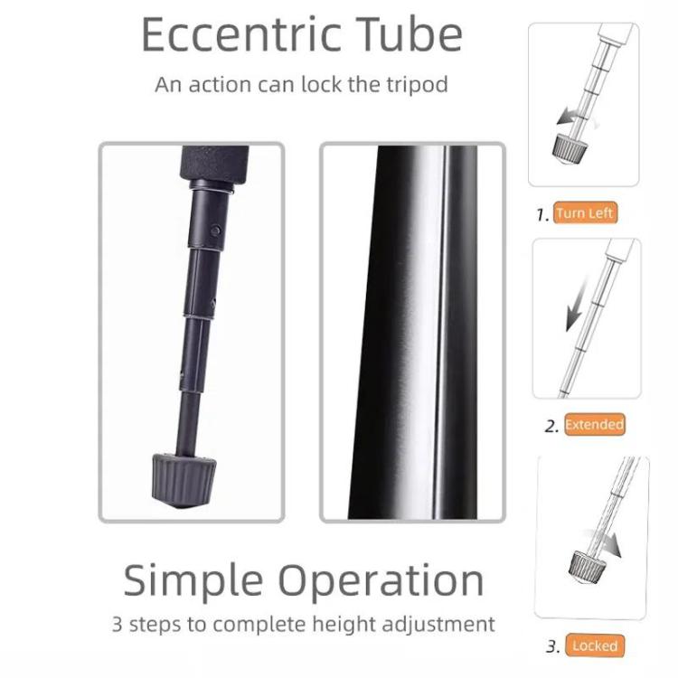 --5-section aluminum alloy legs with 3/8" mounting screw, extendable from 16.5cm (collapsed) to 51cm (max height) and 18.5cm (low-angle mode).