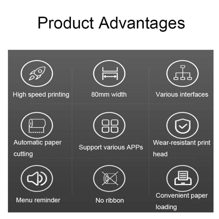 2. Features: Support various APPs, sound and light dual alarm function, high performance, durable, no carbon ribbon, high-speed printing, automatic paper cutting