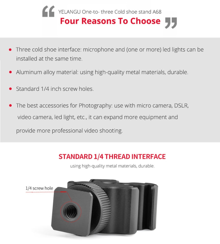 YELANGU YLG0601A A68 3-Head Cold Shoe Mount Adapter Microphone Flash Light Metal Holder Bracket(Black)