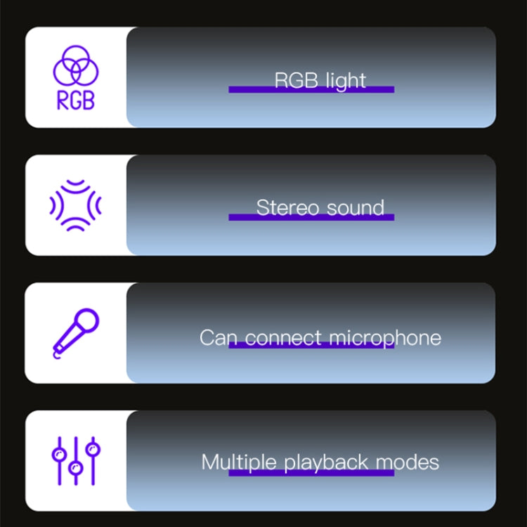 4. Built-in large-capacity lithium battery, long battery life, about 6 hours of music playback time with lights and about 12 hours of music playback time without lights.