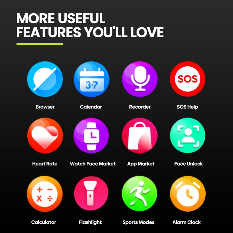 18. Functions: 4G Network(Global Bands), GPS/GLONASS/Beidou, Google Play, Google map, Offline Music, WiFi, Weather, Clock Faces for Any Occasion (Custom Watch Faces), Apps, Clock faces & Notifications, Phonebook, Alarm, Bluetooth, Browser, Calendar, Camera, E-book, MP3, MP4, Additional, Heart rate monitor, Blood oxygen monitor, Pedometer, Call Reminder, Remote Music, Message Notification, Answer Call, Dial Call